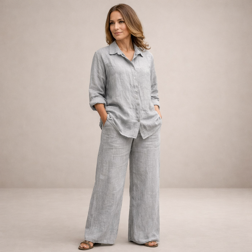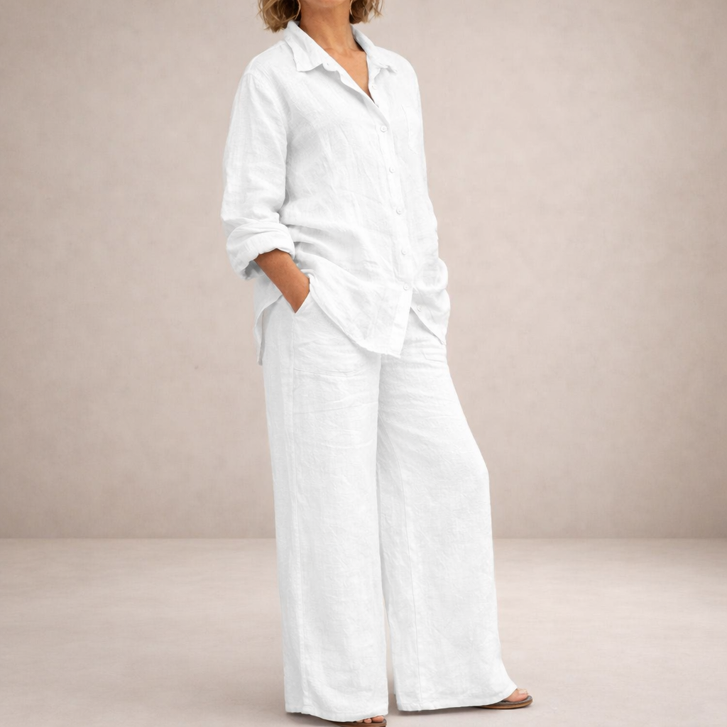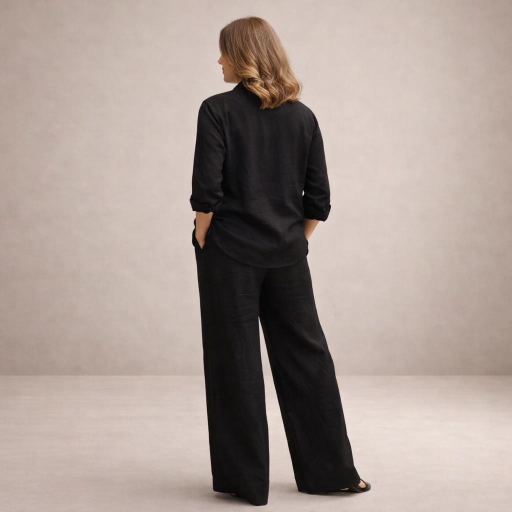 Design: Minimalist button-up top paired with wide-leg trousers, creating a timeless and effortlessly polished silhouette.