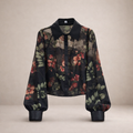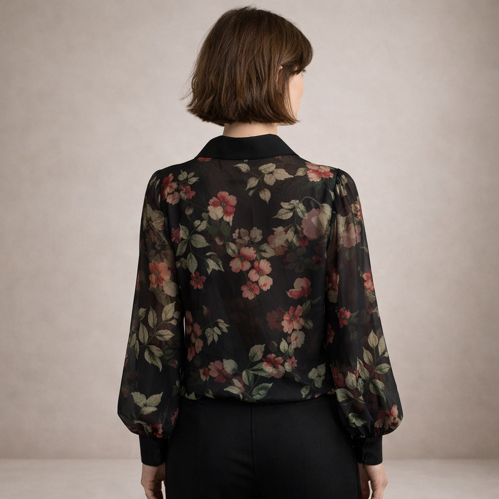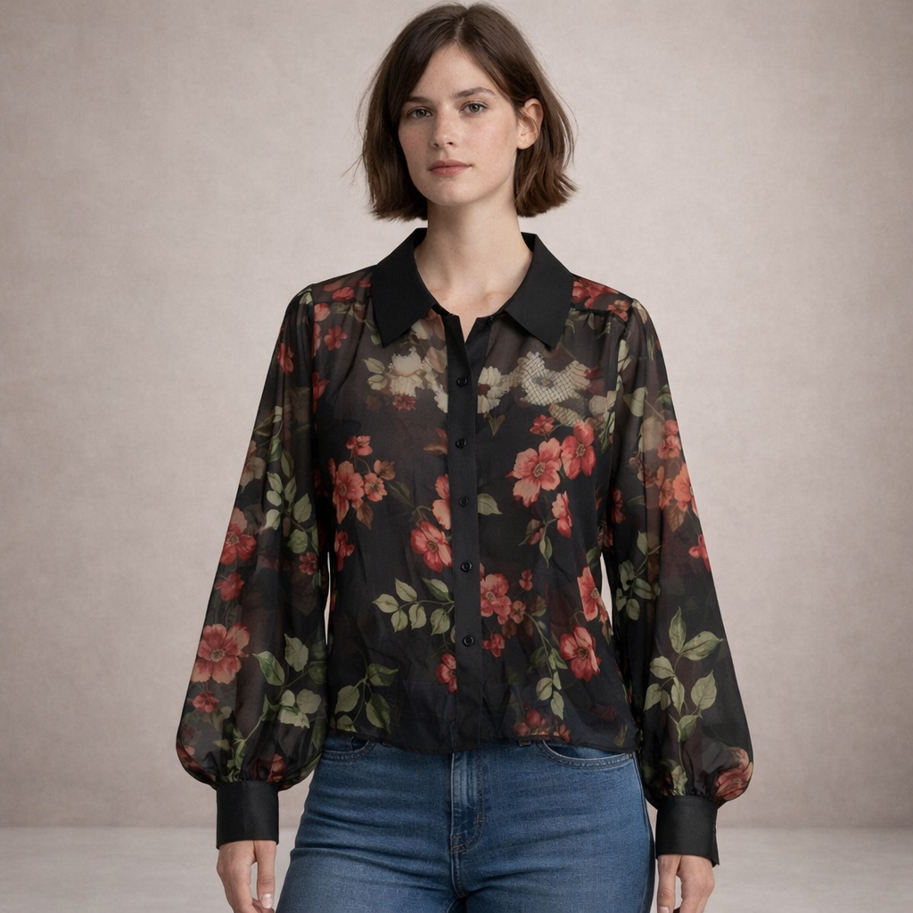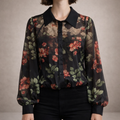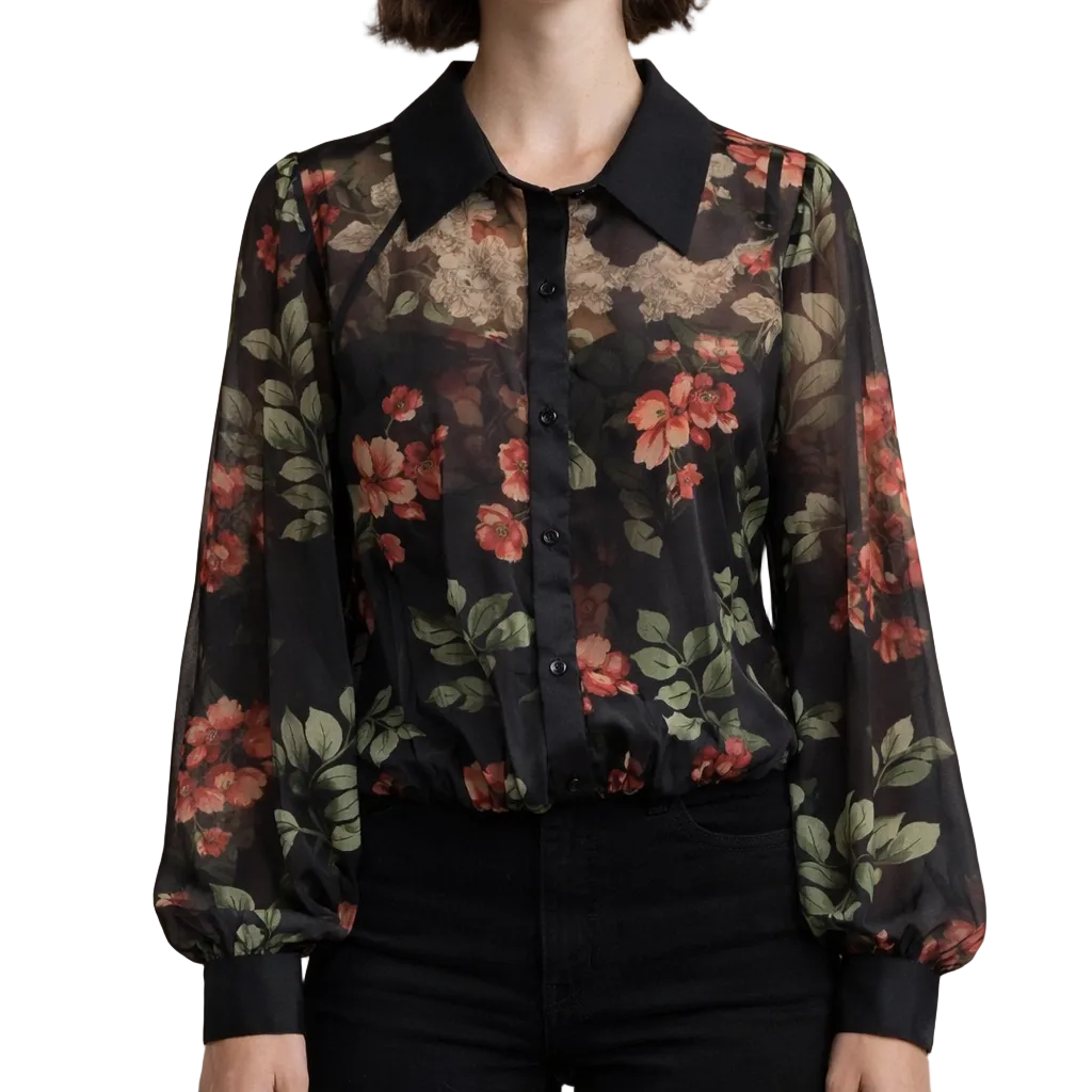 Women’s Sheer Floral Print Blouse with Button Front Black