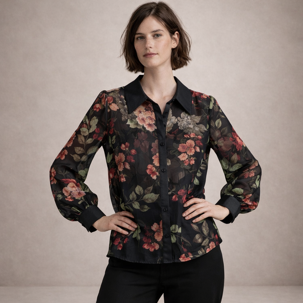 Light, feminine and effortlessly refined, this Women’s Sheer Floral Print Button-Front Blouse adds elegance to both daytime and evening looks. The delicate floral pattern layered over a sheer base creates depth and sophistication, while the structured collar offers a polished finish.