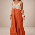 Design: Soft, flowing silhouette with a contrast crochet bodice and gently flared skirt for a relaxed, feminine feel.