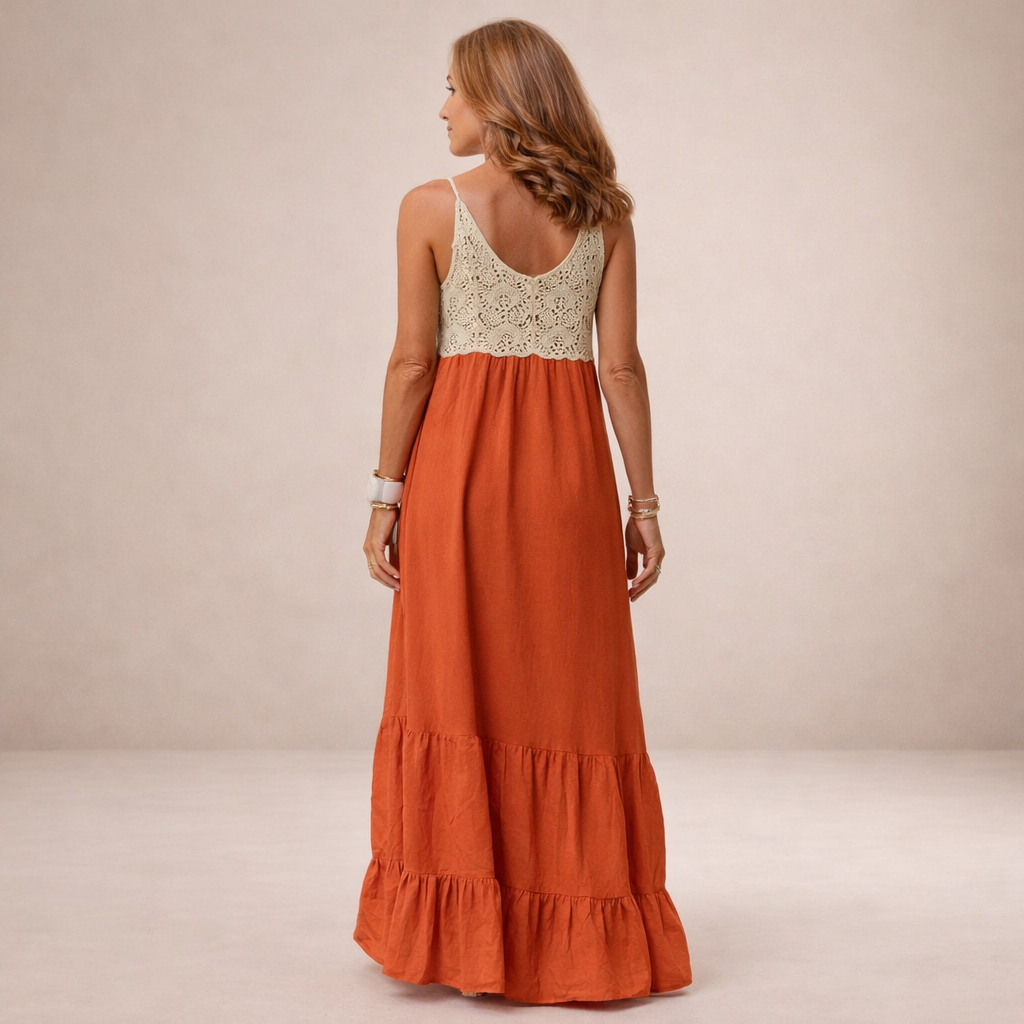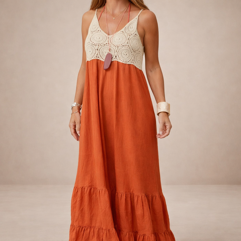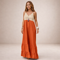 Women’s Sleeveless Maxi Dress with Crochet Bodice and Tiered Skirt