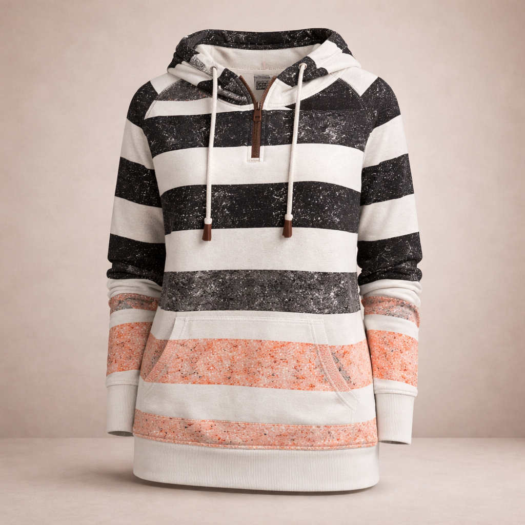 Design: Horizontal stripe pattern with a practical half-zip neckline and adjustable drawstring hood