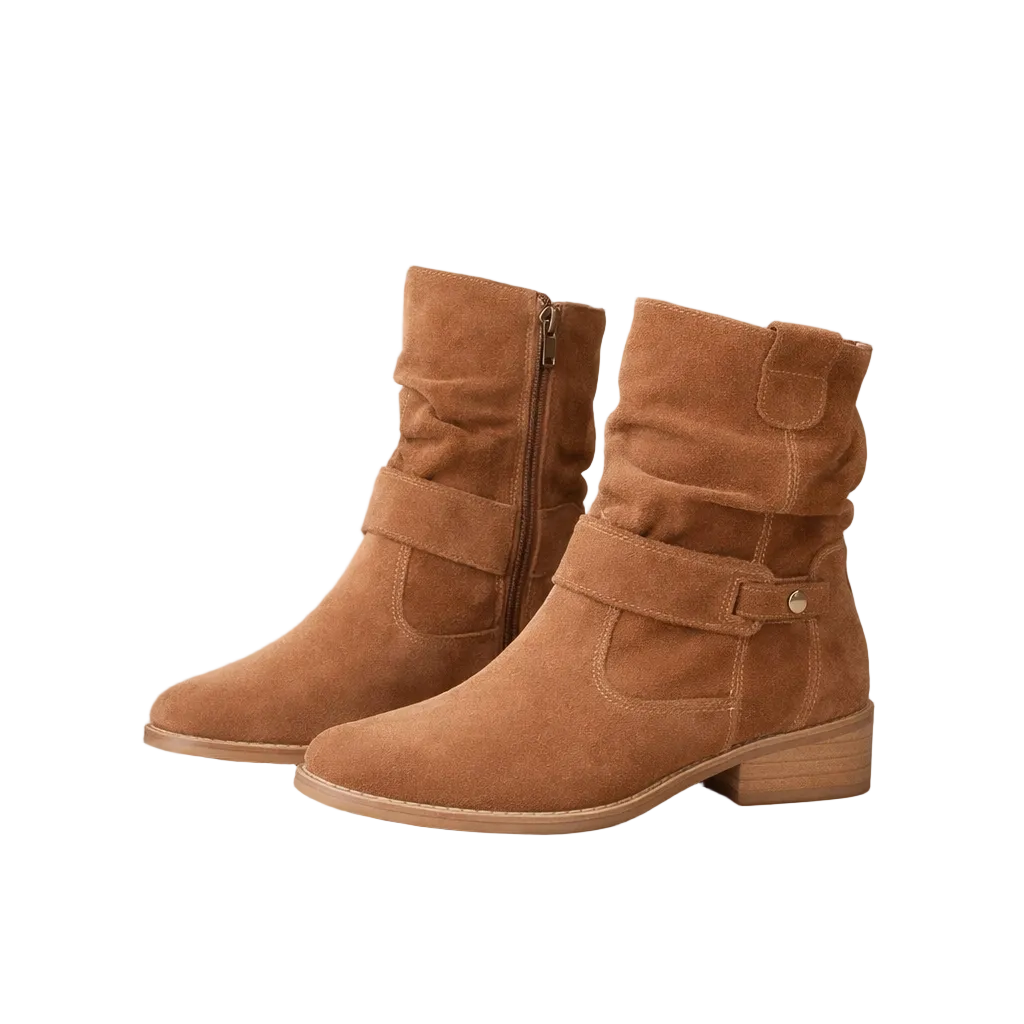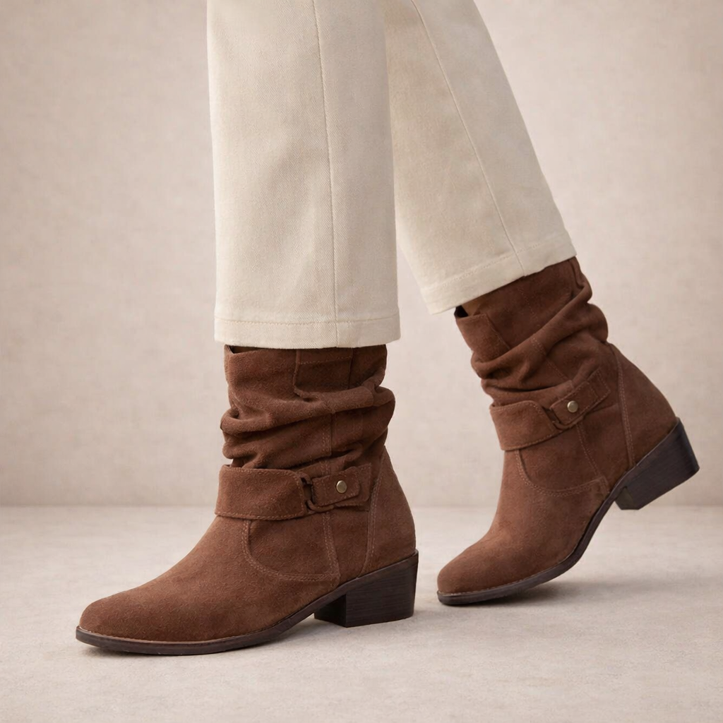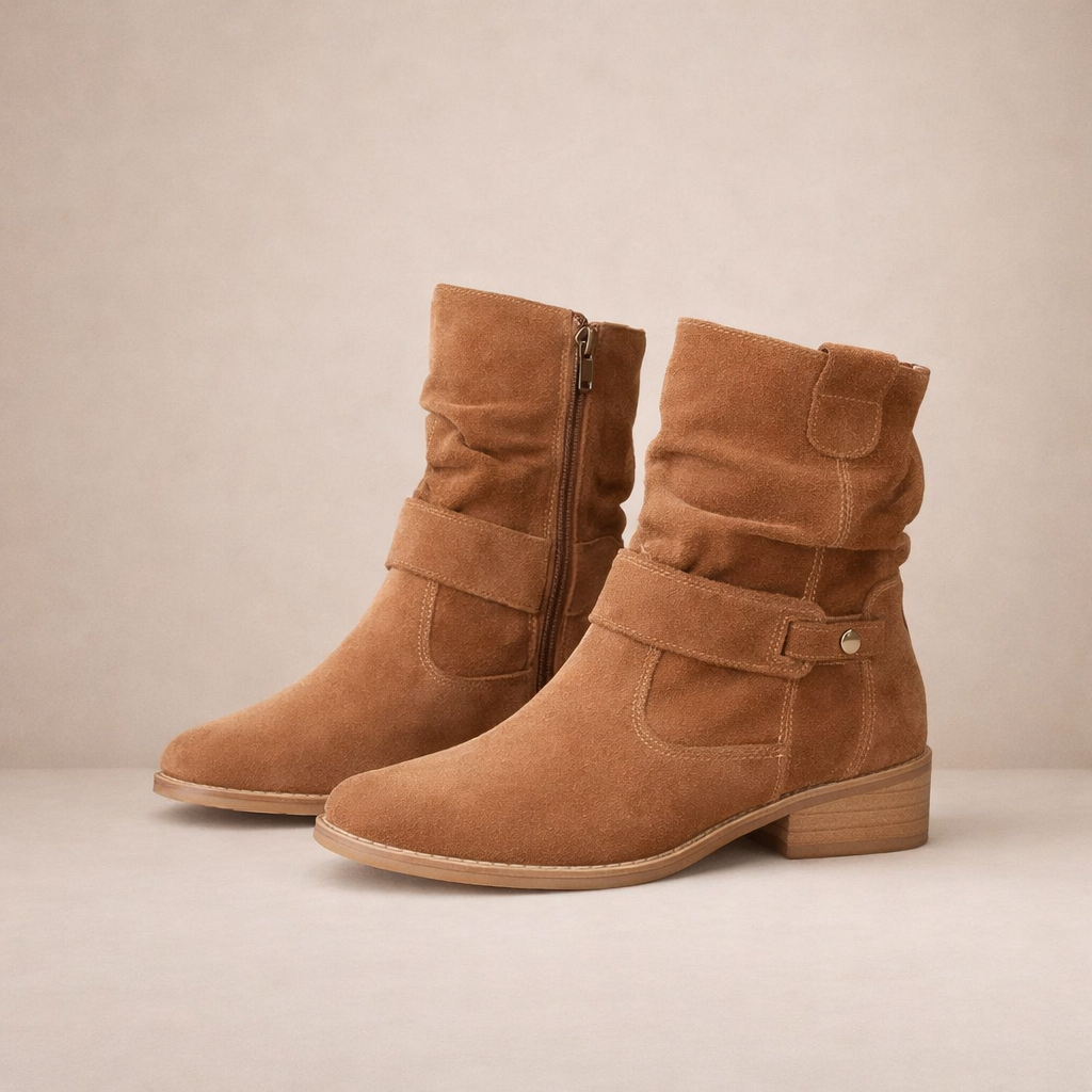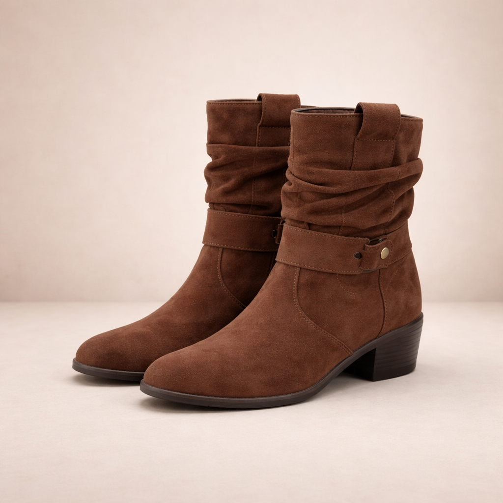 Relaxed yet refined, these Women’s Suede-Effect Ankle Boots with Strap Detail offer an effortless blend of comfort and everyday style. The softly gathered shaft and warm tone create a versatile look, perfect for autumn and winter dressing. Designed for easy wear, they complement both casual and smart-casual outfits with understated charm.