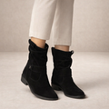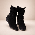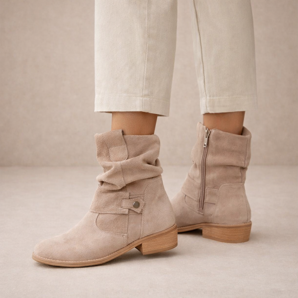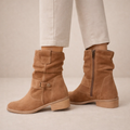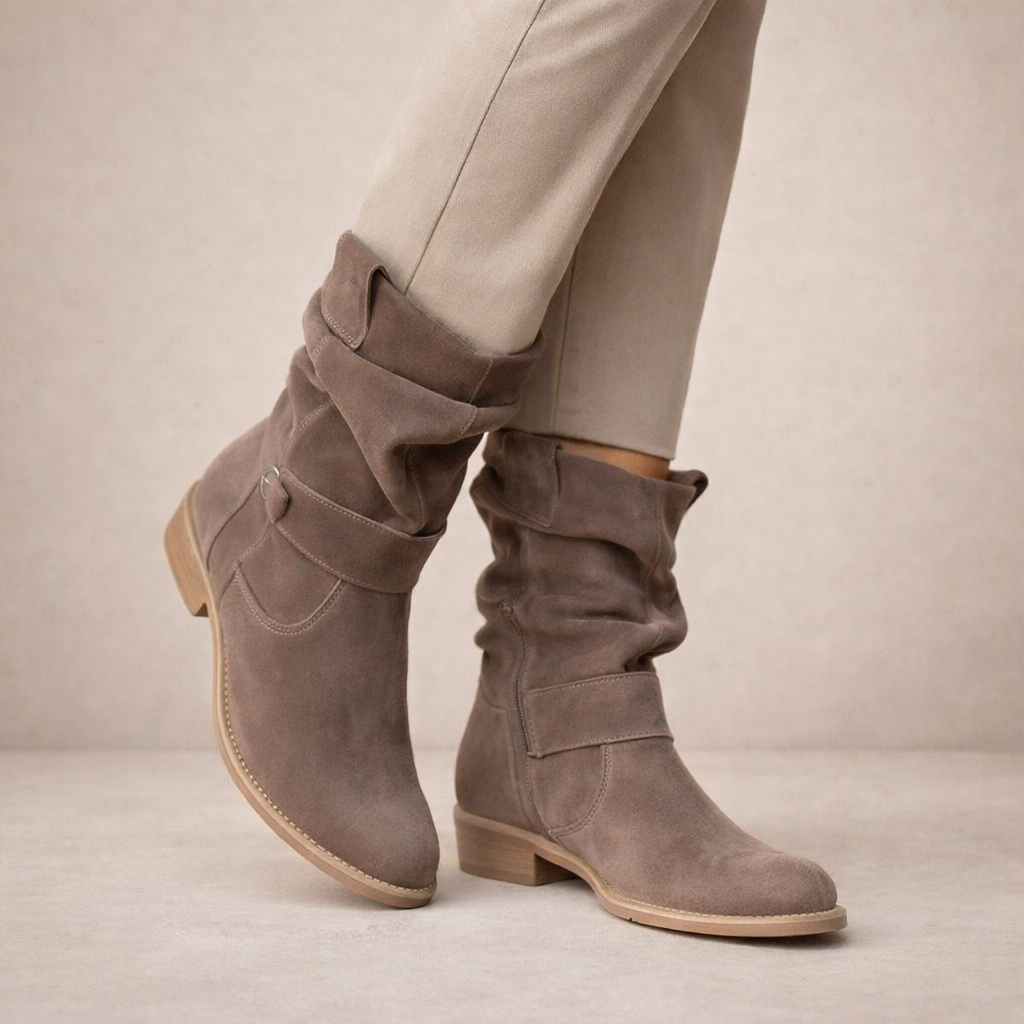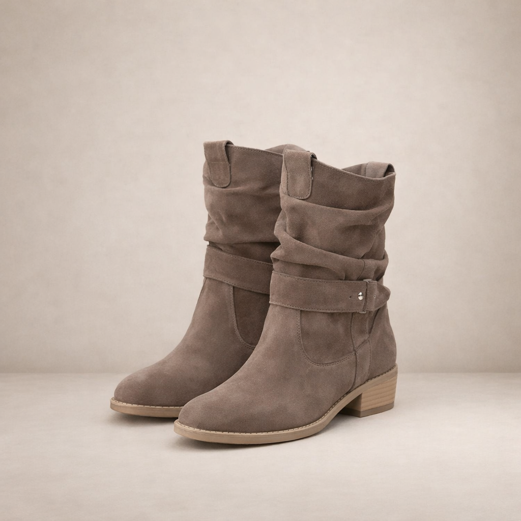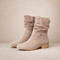 Relaxed yet refined, these Women’s Suede-Effect Ankle Boots with Strap Detail offer an effortless blend of comfort and everyday style. The softly gathered shaft and warm tone create a versatile look, perfect for autumn and winter dressing. Designed for easy wear, they complement both casual and smart-casual outfits with understated charm.