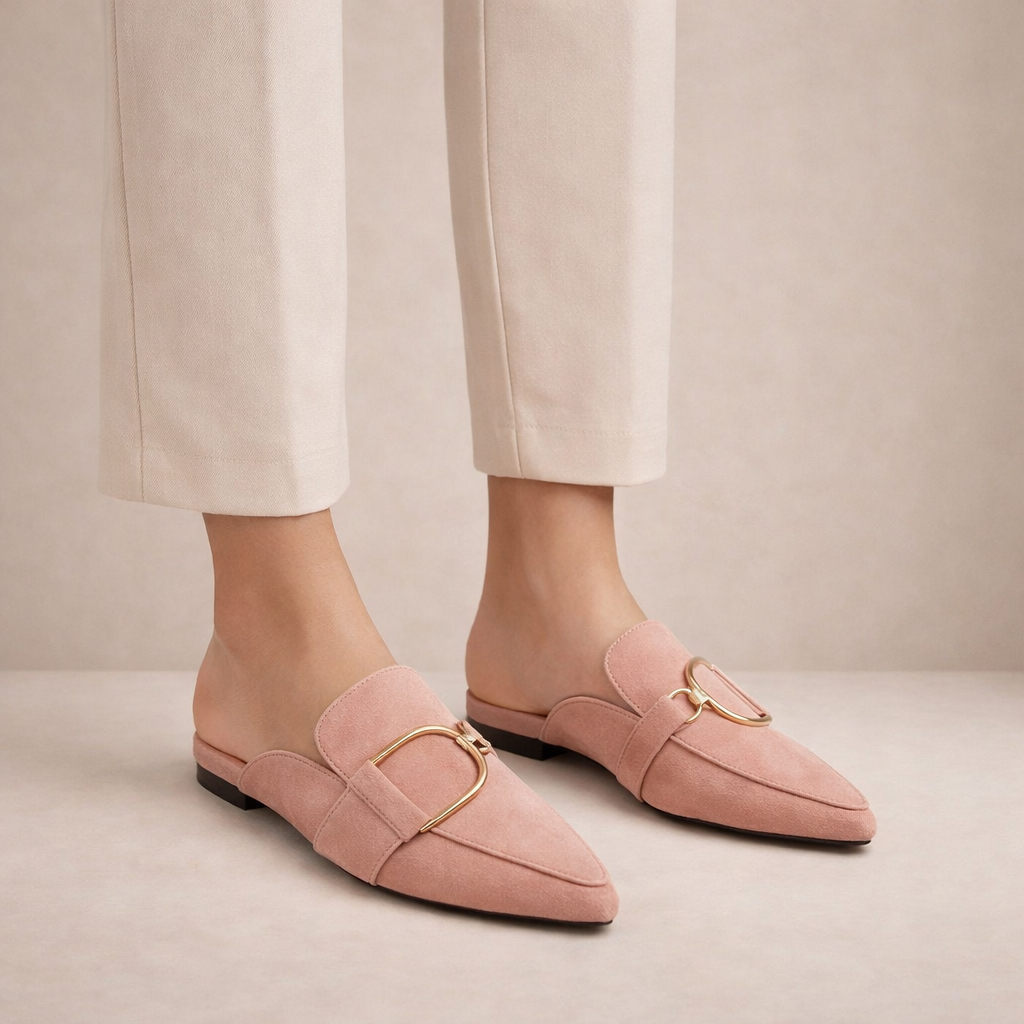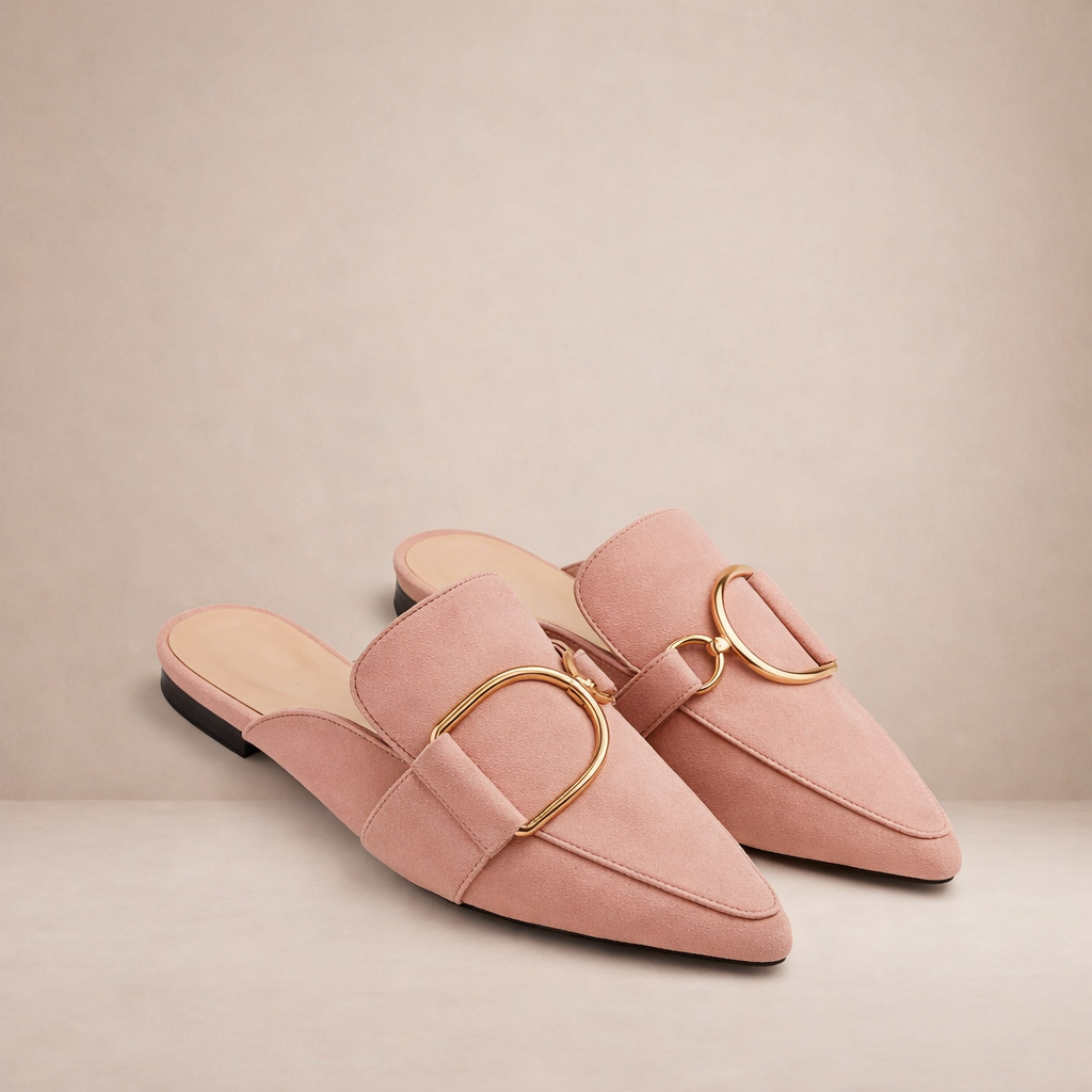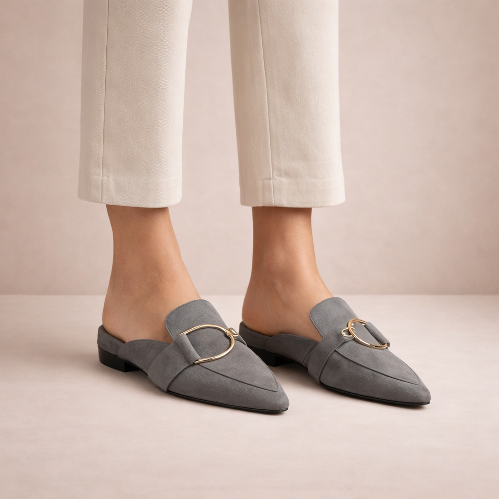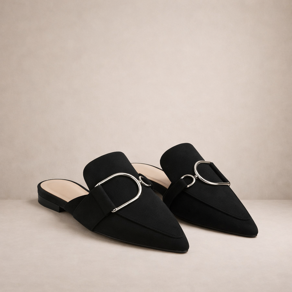 Women’s Suede Pointed-Toe Mule Loafers with Buckle Detail