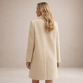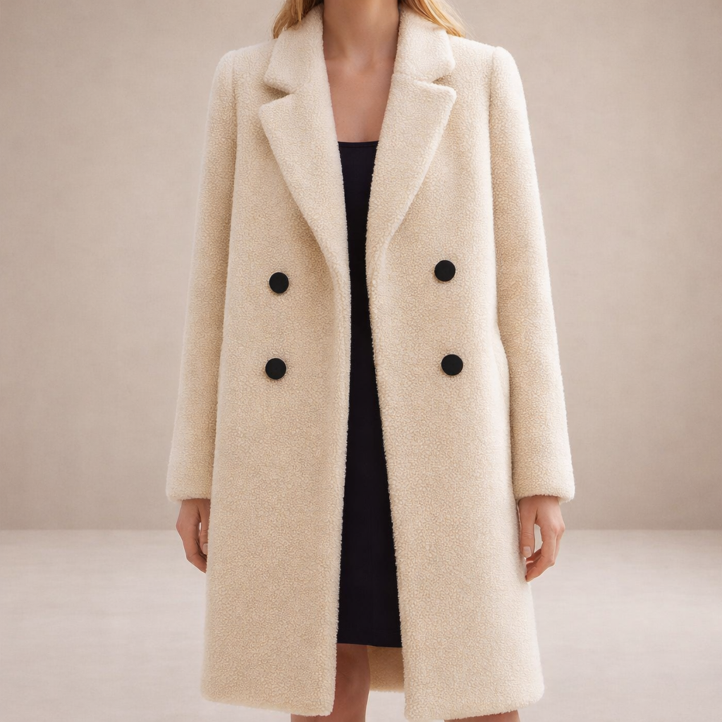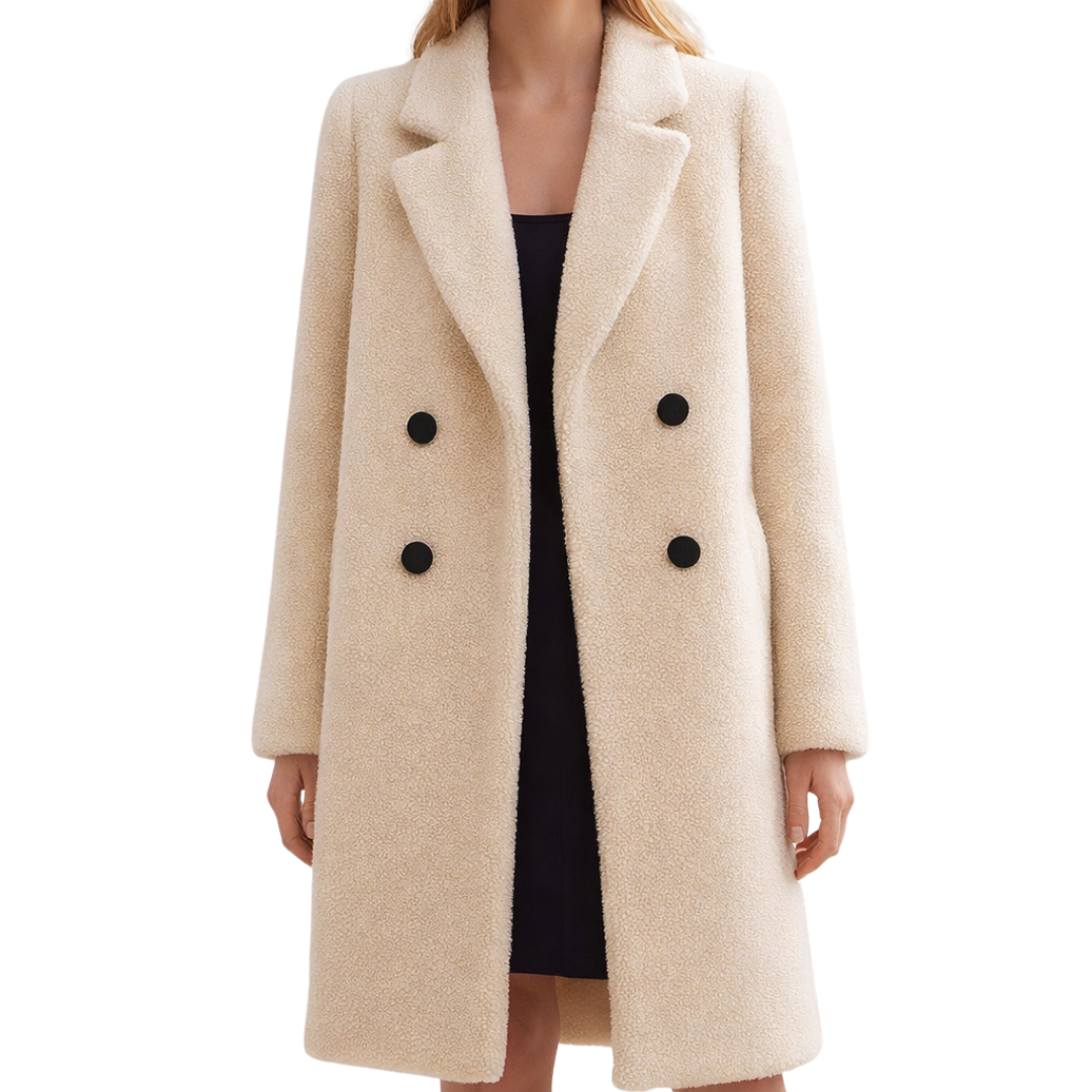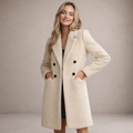 This elegant cream coat is crafted from a softly textured wool-blend fabric, offering warmth with a refined, contemporary look. Designed with a classic double-breasted front and contrasting dark buttons, it combines timeless tailoring with modern simplicity. The clean lines and structured lapels create a flattering silhouette, making it an ideal outer layer for both everyday wear and more polished occasions.