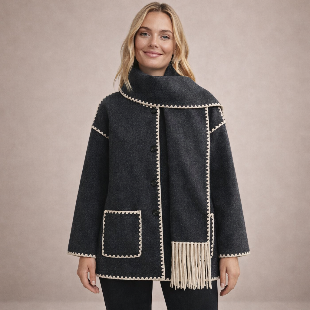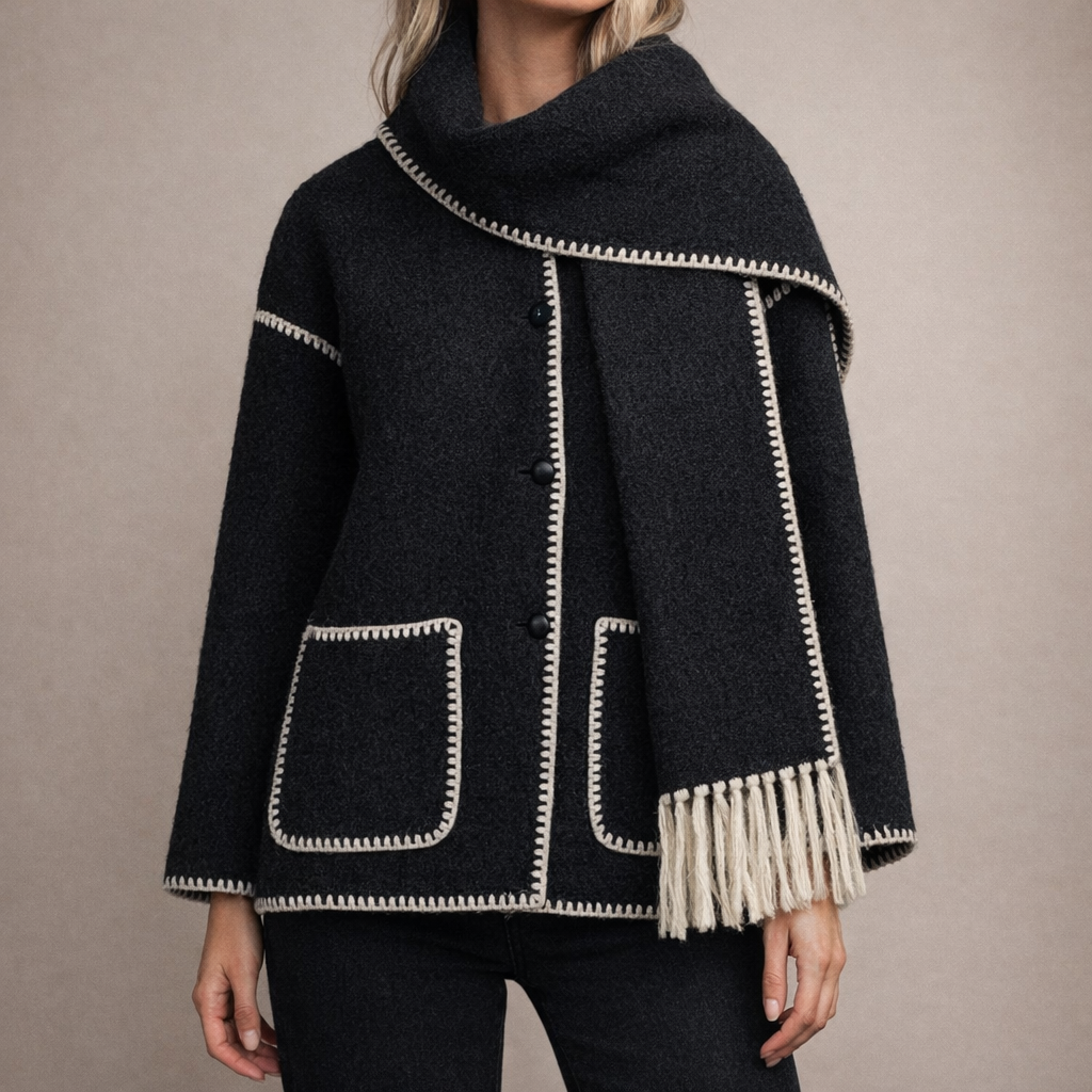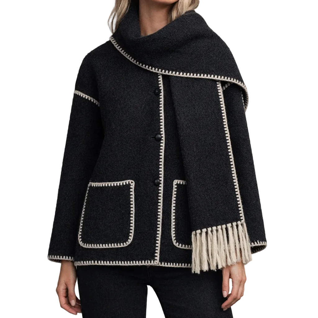 Women’s Textured Wool-Blend Jacket with Fringe Scarf Detail