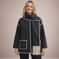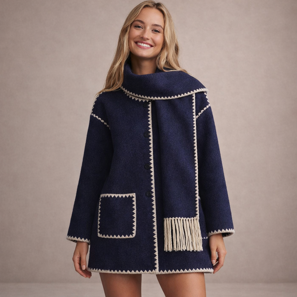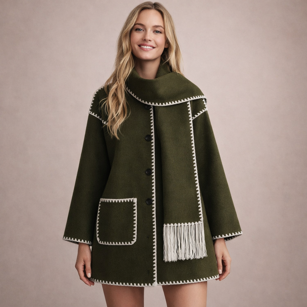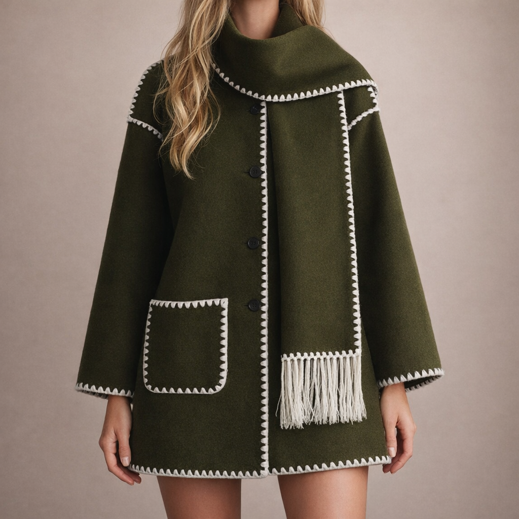 Details: Decorative edging, front button fastening, patch pockets and a coordinating scarf with fringe trim.