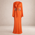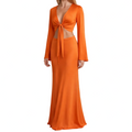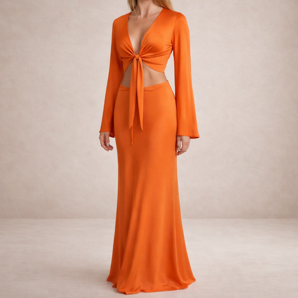 Design: Modern two-piece design featuring a deep V-neck tie-front top paired with a sleek, floor-length skirt