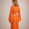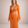 Details: Statement front tie detail, subtle cut-out at the waist, and softly flared long sleeves for added drama