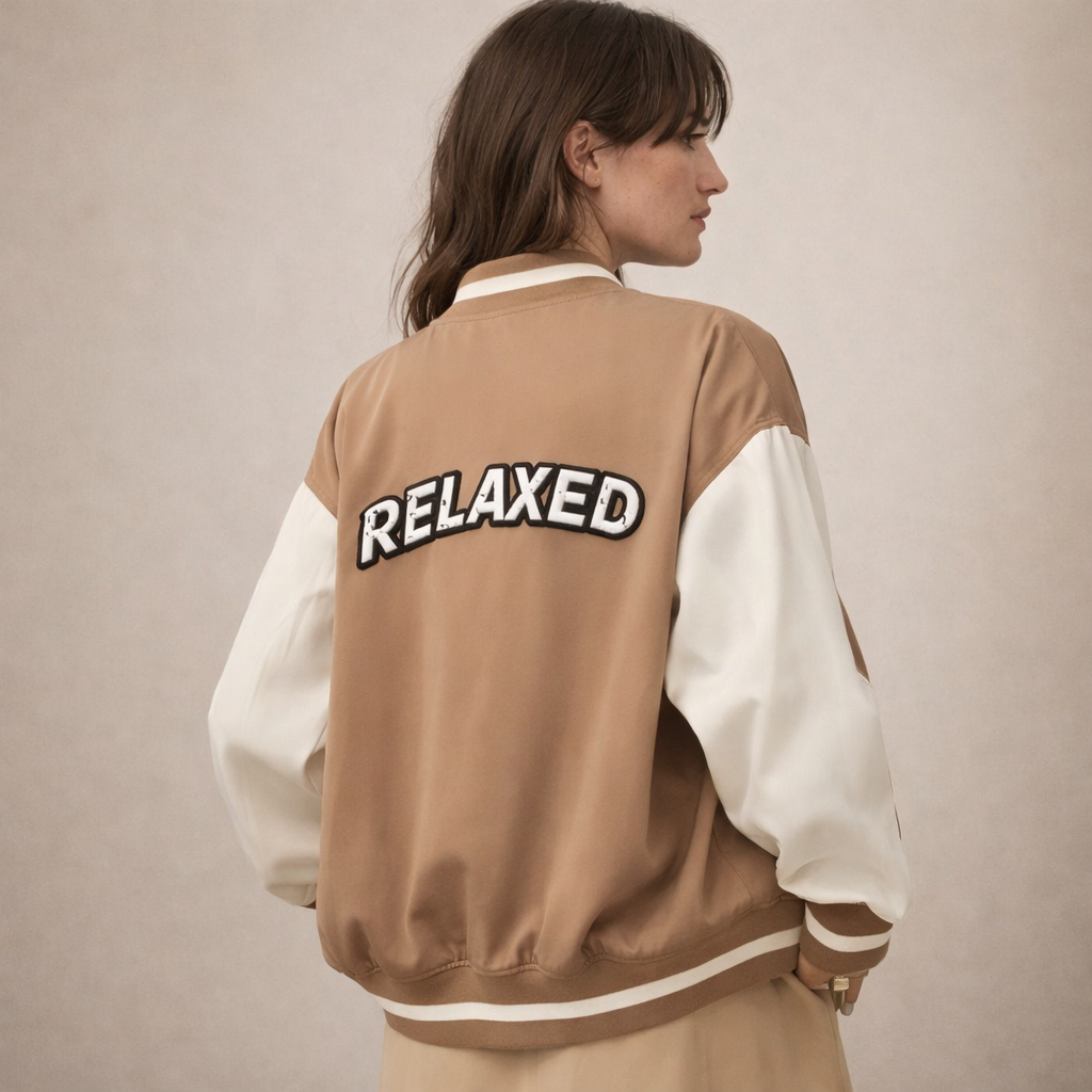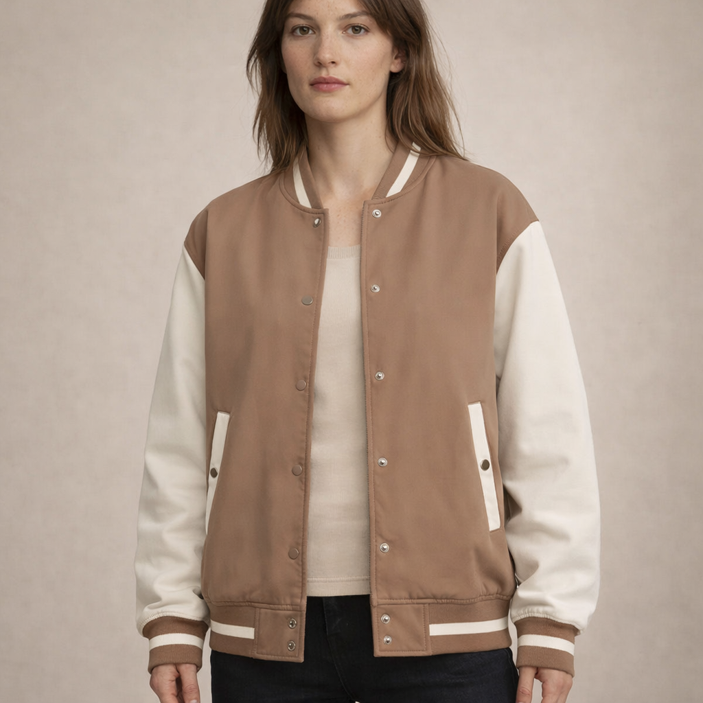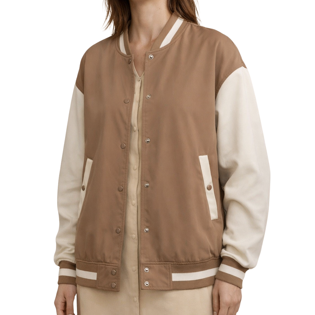 This two-tone varsity jacket adds a sporty yet polished touch to everyday looks. Designed with a classic bomber-inspired silhouette, it features a smooth body contrasted with lighter sleeves for a timeless collegiate feel. Easy to layer and comfortable to wear, it’s a versatile piece that works effortlessly with casual outfits.