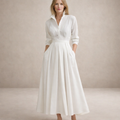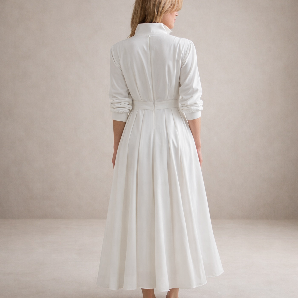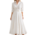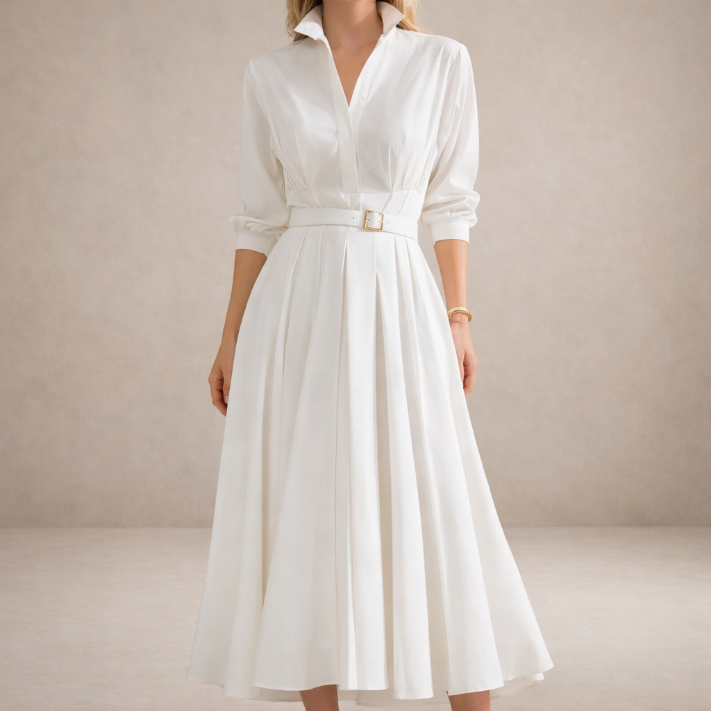 This women’s white shirt dress combines timeless tailoring with soft, feminine movement. Designed with a classic shirt-style bodice and a flowing pleated skirt, it creates an elegant silhouette that works effortlessly for both everyday wear and refined occasions. The matching belt defines the waist, adding structure while maintaining a light, airy feel.