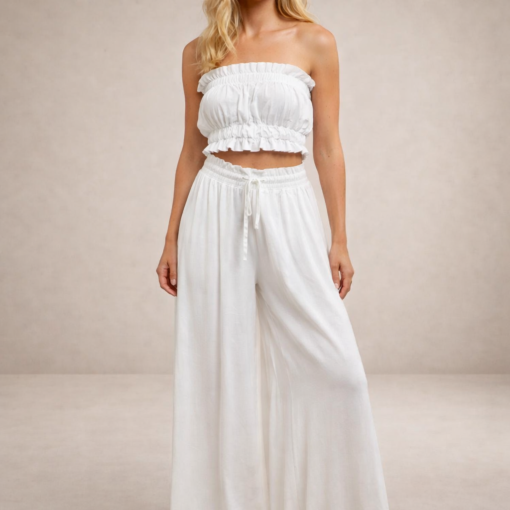 Design: Full-length wide leg silhouette with a softly gathered waistband for a relaxed, contemporary look