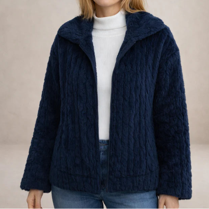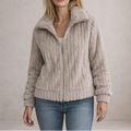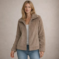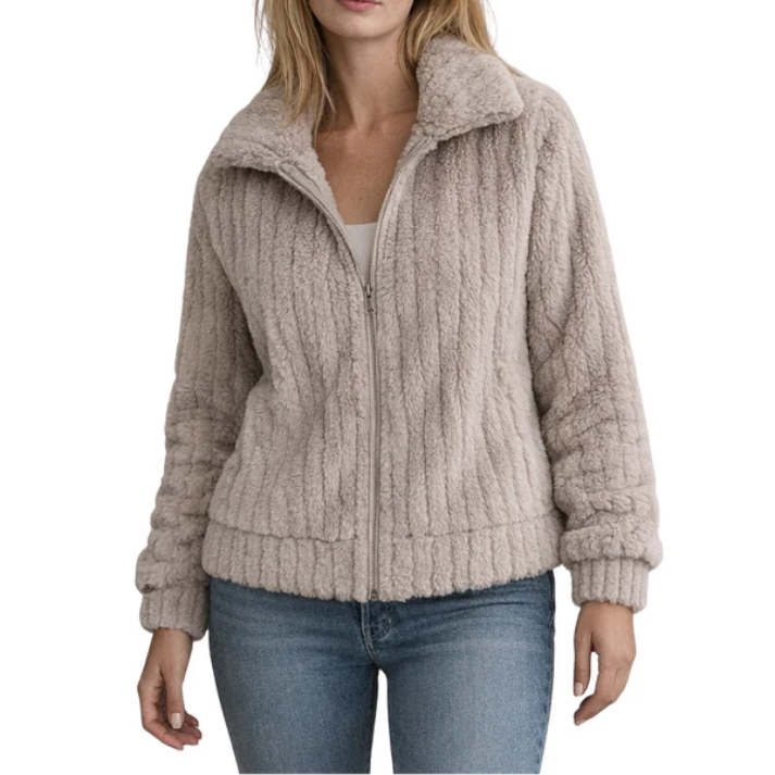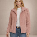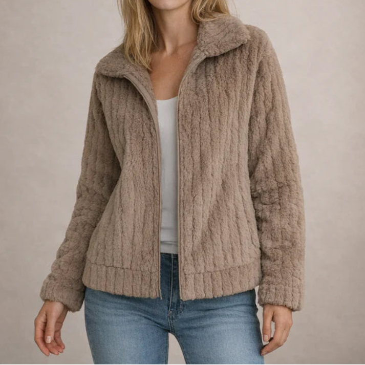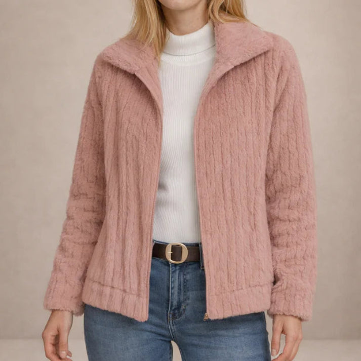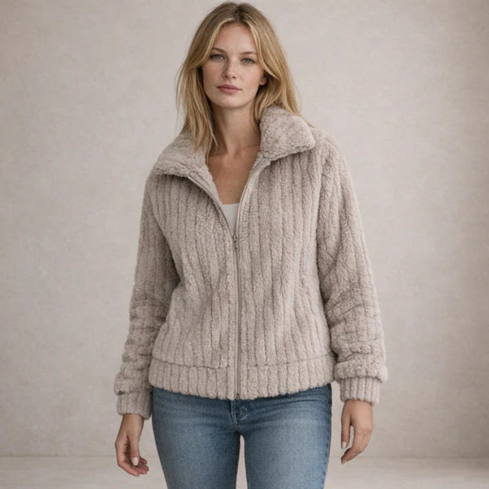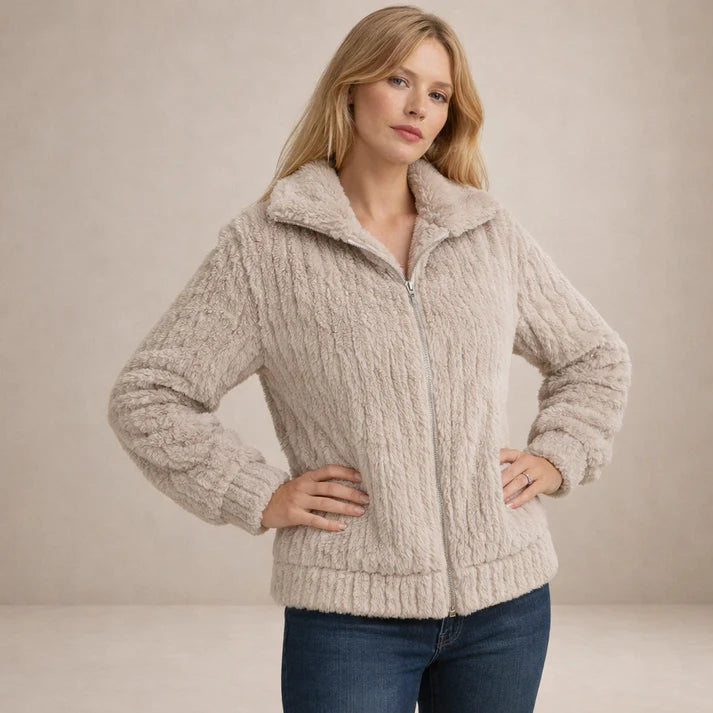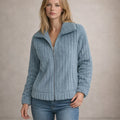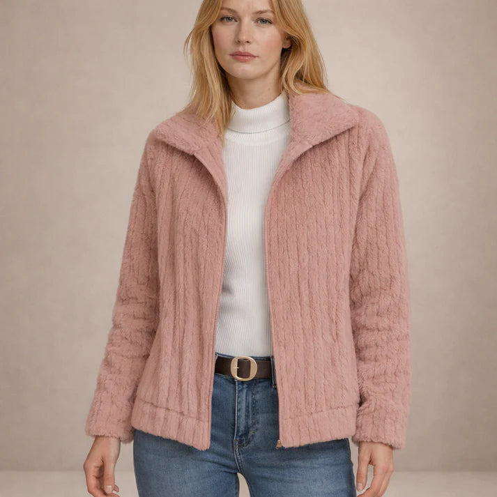 This women’s fleece jacket features a soft, textured outer with a full-length zip fastening at the front. The jacket has a high collar design that extends above the neckline. Long sleeves are finished with elasticated cuffs, and a matching elasticated hem is visible. The fleece fabric shows a vertically textured pattern with a solid colour finish.