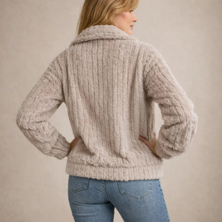 Fabric appearance: Textured fleece fabric with a vertically patterned surface and solid colour finish.