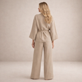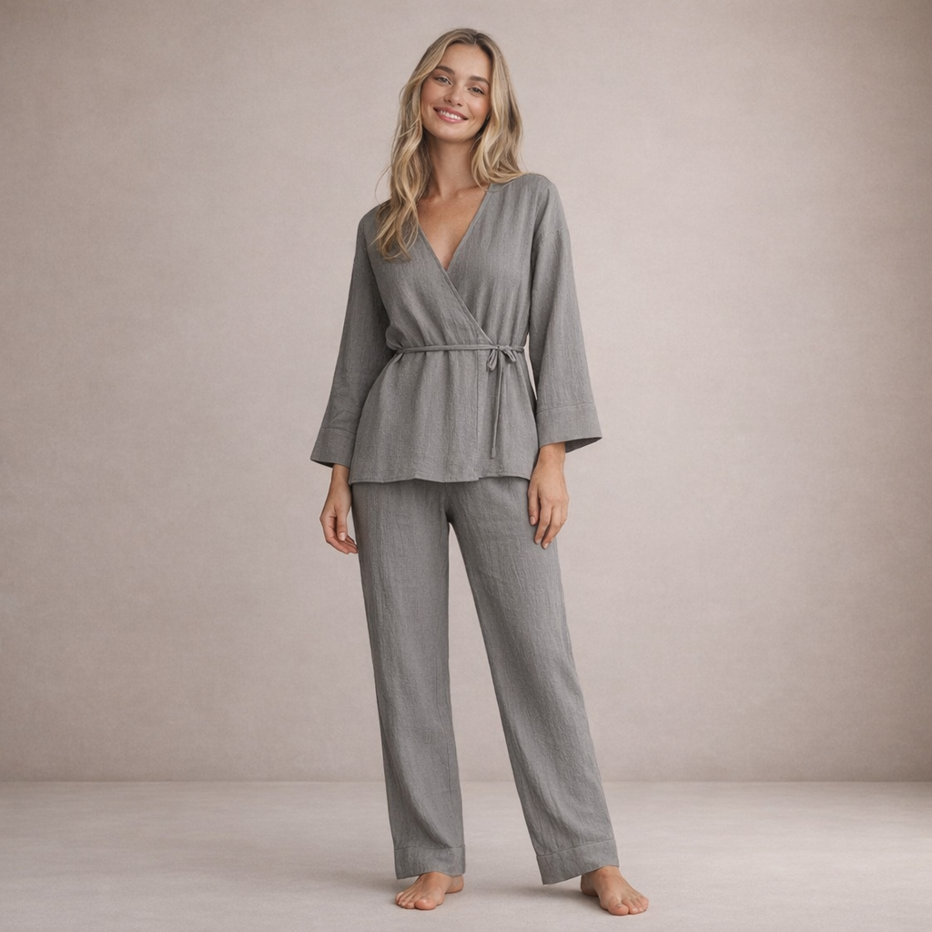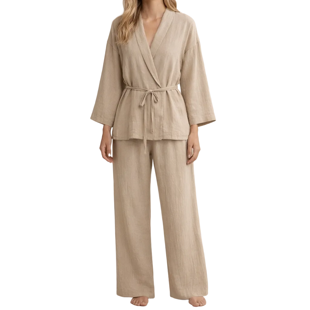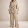Key features of this Women's Linen Two-Piece Wrap Top and Wide-Leg Trousers Set