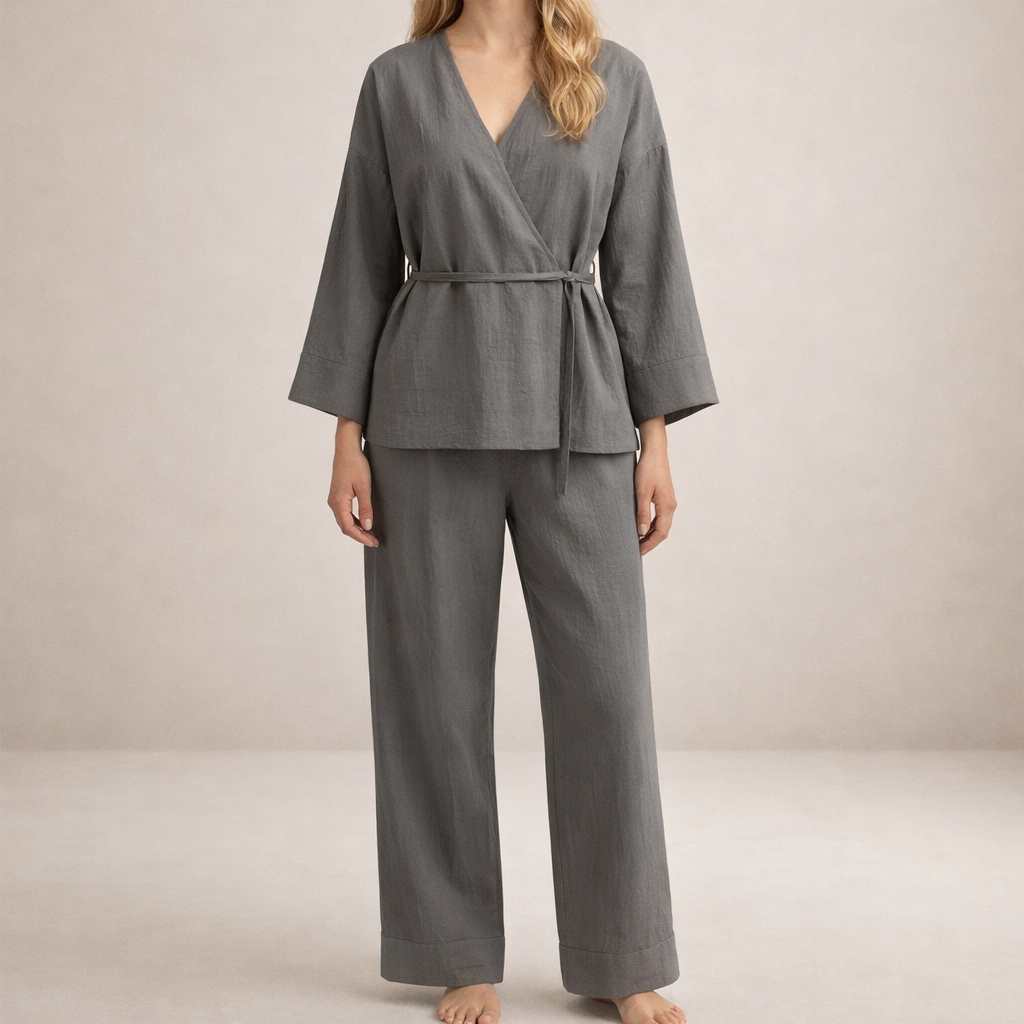 Women's Linen Two-Piece Wrap Top and Wide-Leg Trousers Set