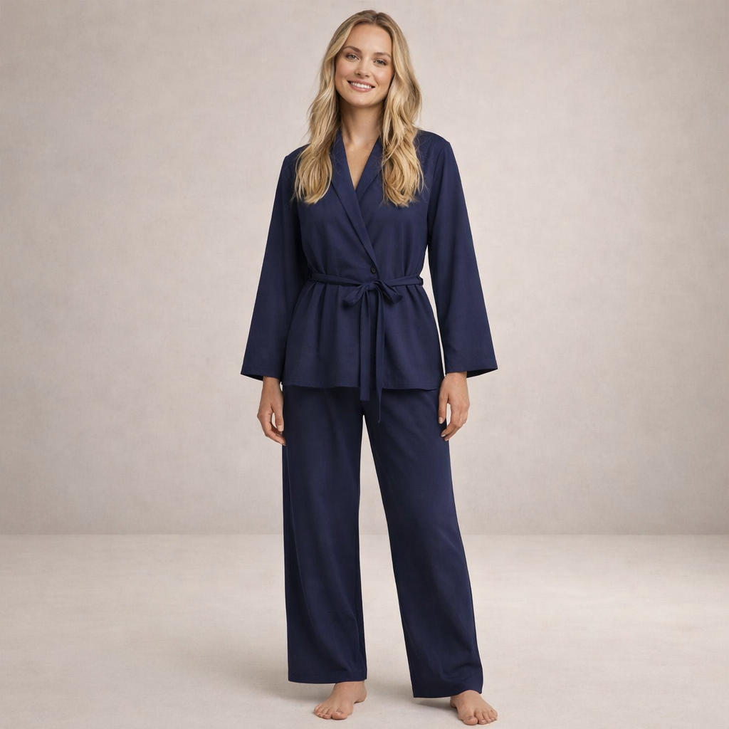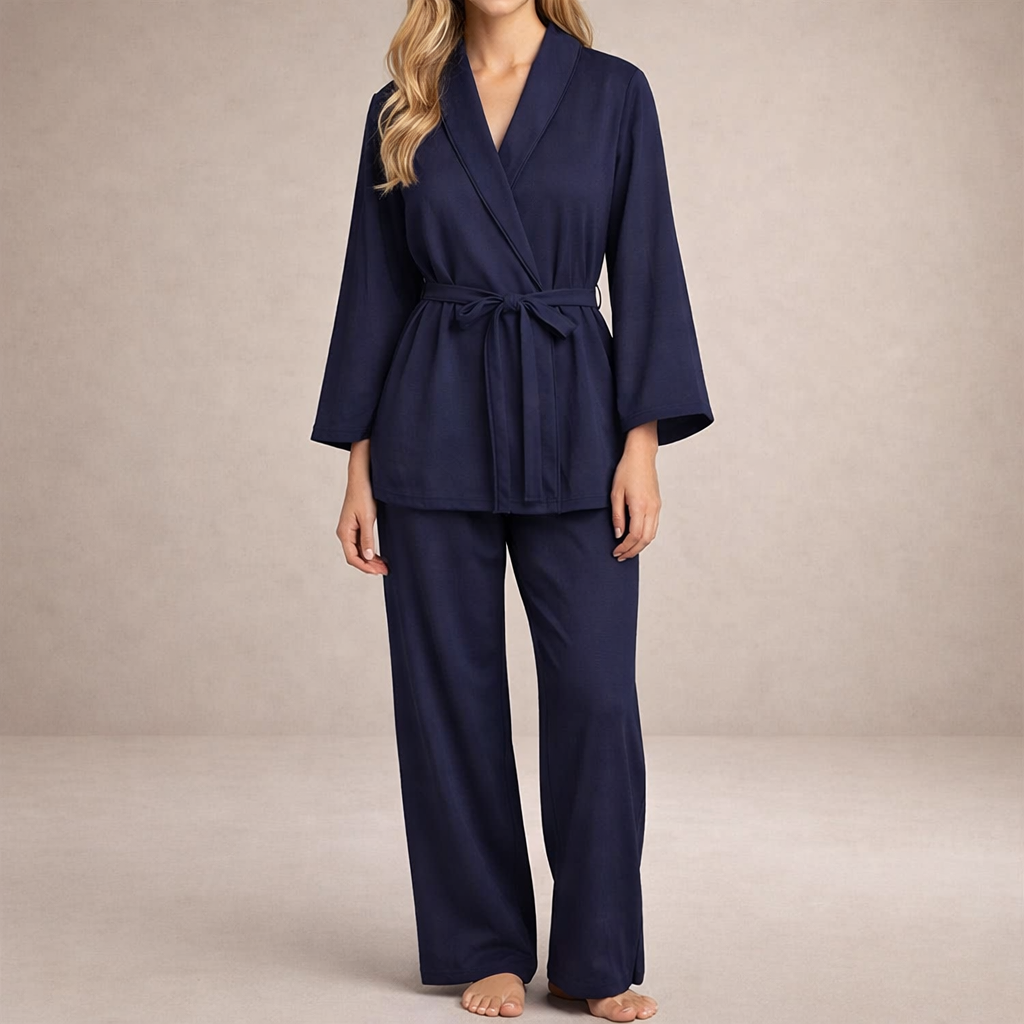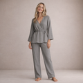 Understated and effortlessly refined, this two-piece set offers a relaxed yet sophisticated silhouette for both home and leisure dressing. The soft neutral tone and fluid shape create a calm, polished aesthetic that feels considered without appearing overly styled. Ideal for laid-back days or elevated downtime, it balances comfort with timeless appeal.